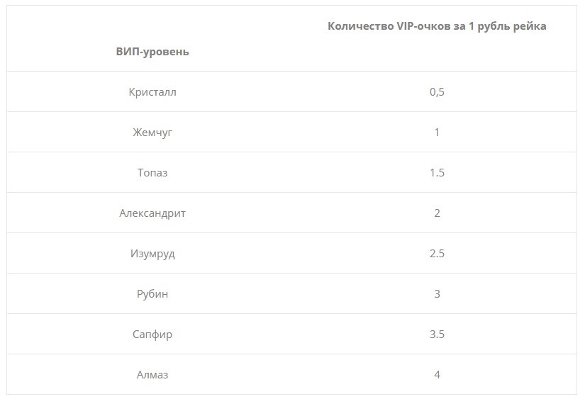 В рамках программы поощрения очки начисляются игрокам за генерирование рейка. Чем выше VIP-уровень покериста, тем больше баллов он получает за 1 рубль рейка: